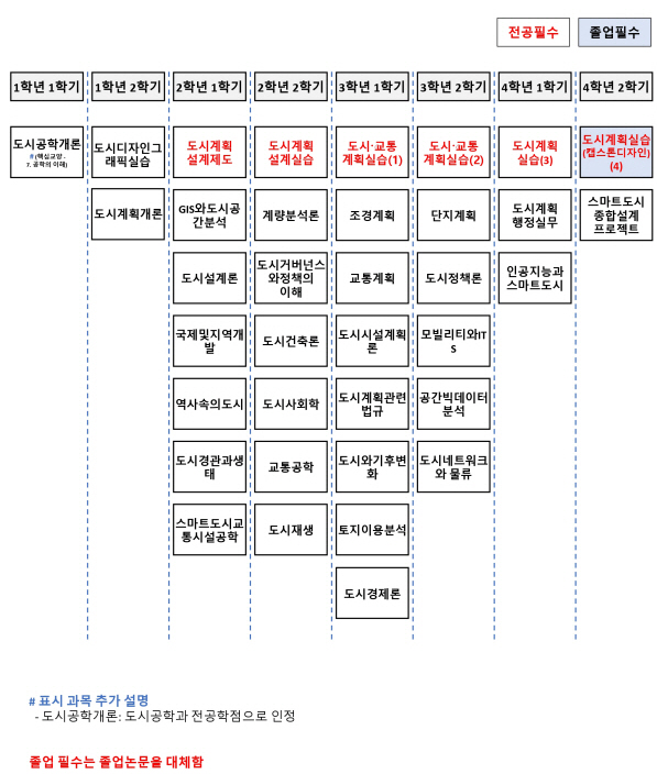 도시공학과 졸업을 위해서는 132학점 이상을 취득해야 하며 그중 전공과목은 50학점(전공필수 과목 모두 포함) 이상을 이수해야 합니다.
